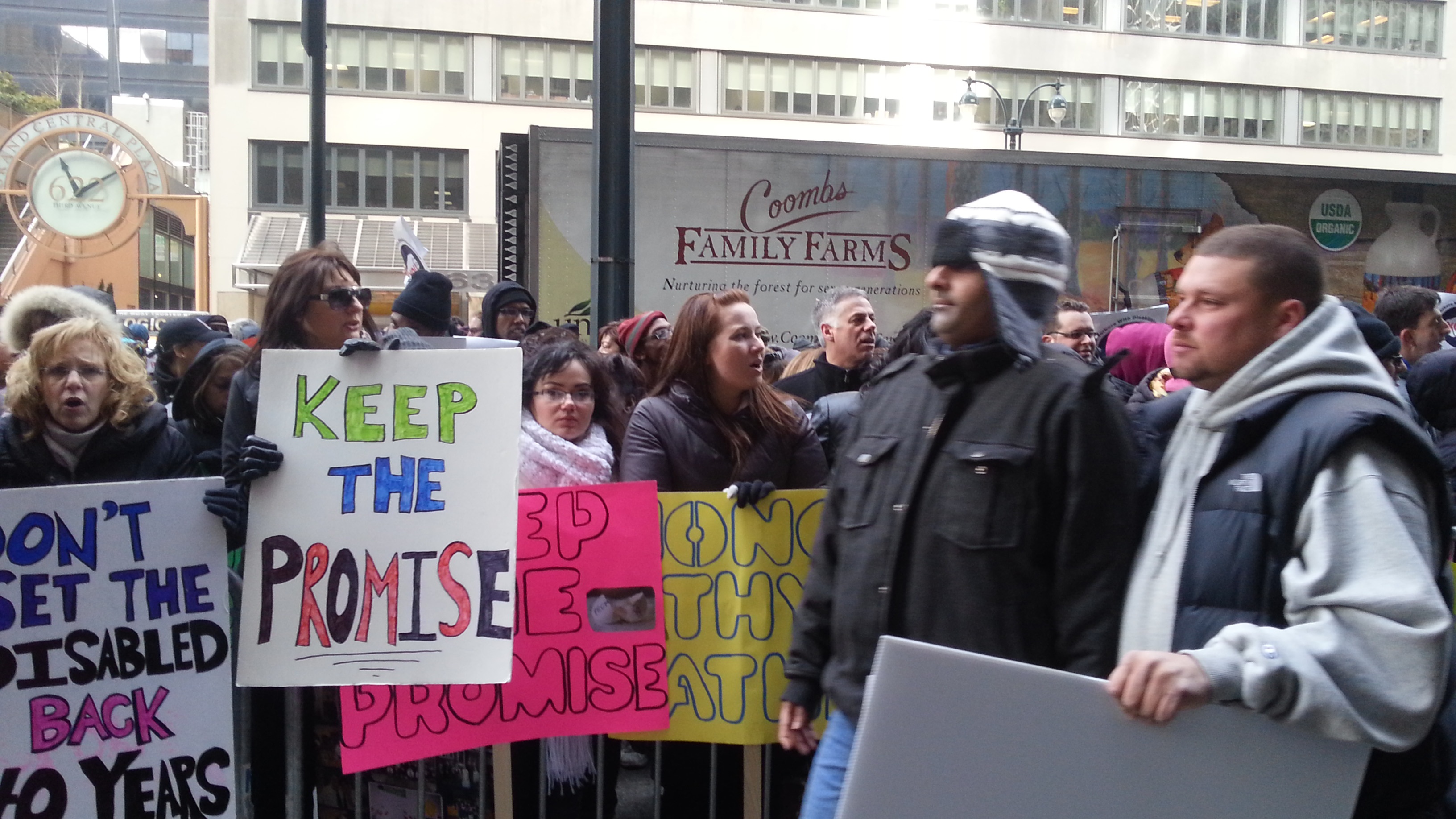 NEW YORK, March 15 – Shouting “Hell No, Cuomo,” and “Governor, Have Some Guts, Restore the Cuts,” several hundred people with developmental disabilities, their family members and the workers who care for them protested outside of Gov. Cuomo’s Manhattan office Friday against his proposed $120 million cut in funding to the nonprofit agencies that provide critical services to one of the state’s most vulnerable populations.